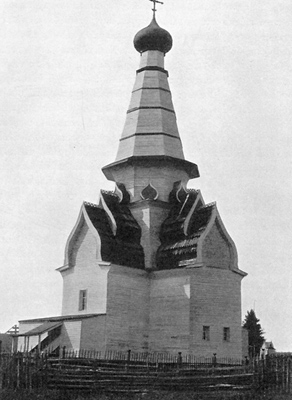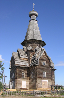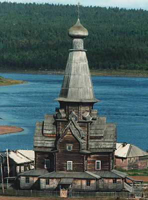 Успенская церковь, расположенная на правом, Пречистенском (или Успенском) берегу реки Варзуги, построена в 1674 году и дошла до нашего времени без существенных перестроек. Это выдающееся произведение деревянного зодчества, относящееся к группе шатровых церквей. Специфической архитектурной особенностью церкви является прием "расщепления бочек", при котором бочки верхнего яруса опираются на покрытие нижних. Церковь считается одной из лучших построек среди деревянных одноглавых шатровых церквей Русского Севера. Известный искусствовед И.Э.Грабарь обратил внимание на сходство Успенской церкви с московской церковью Вознесения в Коломенском. В середине XIX века церковь была обшита досками и выкрашена. Такое "обновление" исказило ее внешний облик.